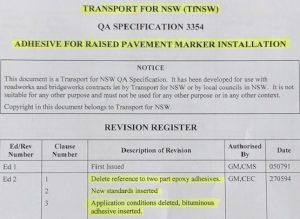 One day sometime in 1986 I received a telephone call from Ari Madden the Chief Scientific Officer of VicRoads. I knew Ari quite well through various meetings and conferences over the years and more recently of course through my thermoplastic development. Ari explained that they were experiencing a lot of issues with the application of the raised pavement markers on the road through the use of an epoxy that was used to adhere the markers to the pavement causing some workers to suffer with dermatitis, a type of skin complaint known as eczema. Some workers suffered more than others and what they found was that it created a lot of loss time through worker’s going of sick, some for a lengthy period and on returning to work the mere smell of the product would flare the eczema again. VicRoads had some very special machinery specially designed so that the two-part mixture could be mechanically mixed without man handling. Ari said he was investigating the possibility of the use of a different type of adhesive that was not a danger to one health and that he was inviting some 8 different companies to come up with something that he could trial. The situation was that I was one of the chosen companies and we were given a period of nine weeks to present something to him that only his people could handle and trial. The trial was to be also given nine weeks of testing and all presenters of the material were not permitted to attend or be given the name of the location of the test site.